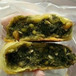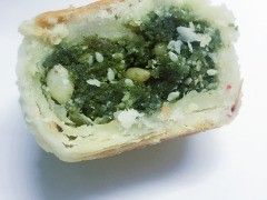 将苔菜馅分成约25g一个小团,备用。(馅料会有些散,捏实些,有点油)再用备注-2的材料做水油皮。将所有材料放入面包机,启动和面程序。(手工揉面亦可,这是偷懒的做法)