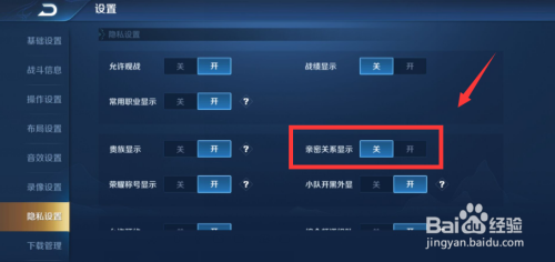 王者荣耀是不能单个隐藏某个关系的,只能全部开启或者全部关闭关系显示,如果要单个隐藏只能解除关系,所以还是建议全部隐藏比较好。