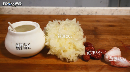 食材准备银耳20g,鱼胶150g,红枣5个,白糖20g。