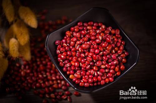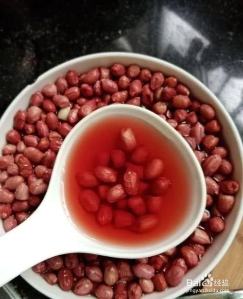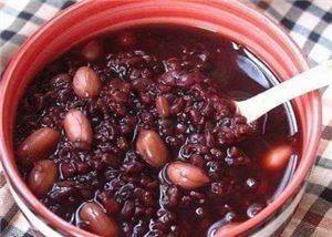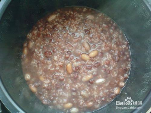 电饭锅内放入红豆、花生米和适量水,按煮粥键,煮粥。