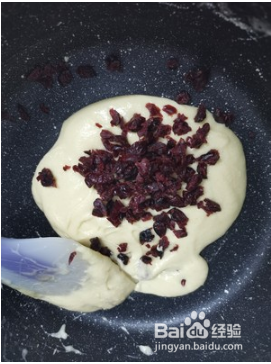 黄油融化好后依次倒入奶粉混合,混好后最后加蔓越莓