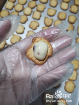 手戴一次性手套,把做好的牛扎糖托圆,放在饼干上面