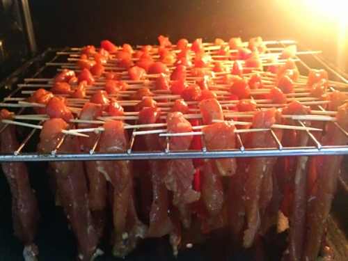 注意:肉条的大小,风干的程度,肉量的多少以及烤箱的问题都会影响烤制时间。所以必须根据实际情况调节时间,中途可开烤箱查看一下。 -