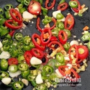 锅里放油先放适量豆豉炒香,然后放入姜蒜炒香。
