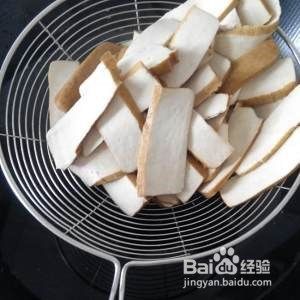 锅中烧开水,水开后将香干片倒进去煮一分钟捞起控干水分备用。
