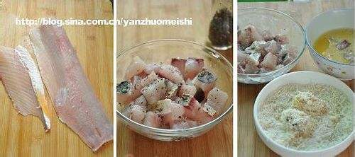 4、锅中倒入橄榄油,油热至六成时,放入鱼块,炸至面包糠微黄时捞出沥干油即可。