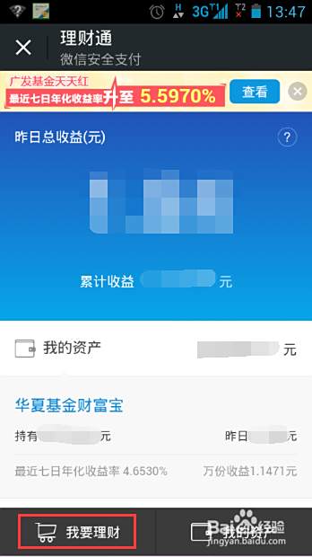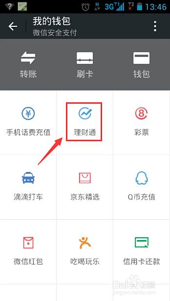 点击【我的钱包】界面里的理财通,进入理财通界面,通过该界面可以查看自己购买的基金数额及收益情况。