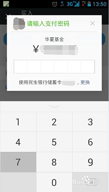 输入自己设定的微信支付密码,如果密码正确即可将微信关联银行卡里的钱转存到微信理财通里,如下图所示。