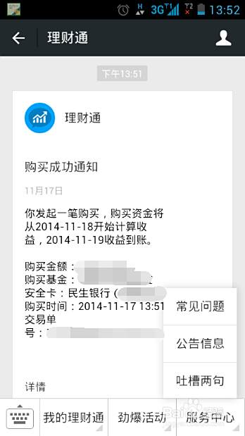 此时微信系统也会向你发送一条购买成功的消息记录,如下图所示。此时理财通产品购买完毕。
