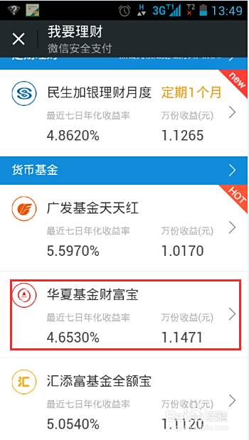 点击左下方的【我要理财】按钮,进入【我要理财】界面,在该界面下可以查看各个理财产品的收益率。如下图所示。