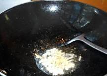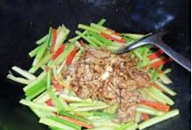 留底油下蒜姜炒香,再把牛肉倒入迅速翻均再次铲起备用。
