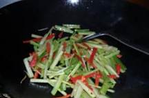 另起锅放少许油下西芹、红椒炒至八成熟。