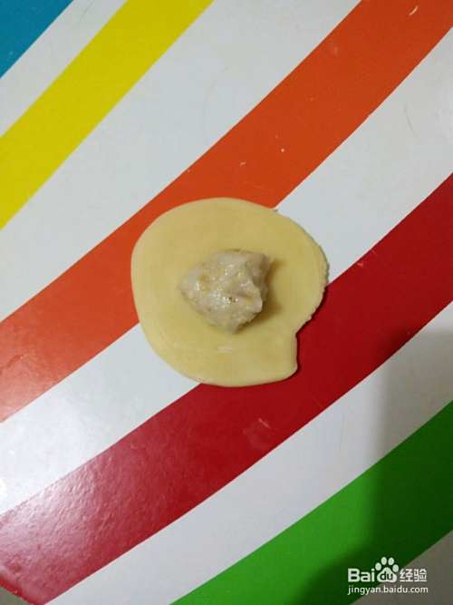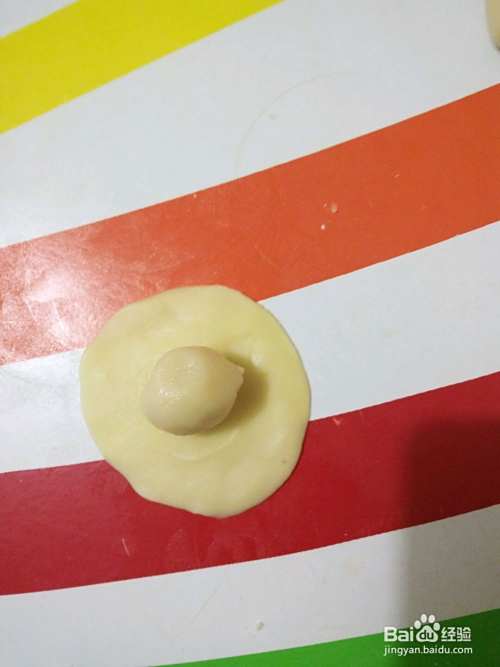 取第一个小团立着再按扁 擀成中后边薄的圆形放一个糯米馅包好收口朝下