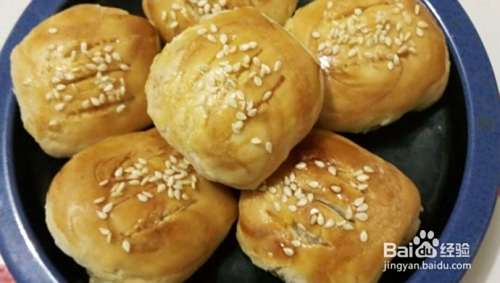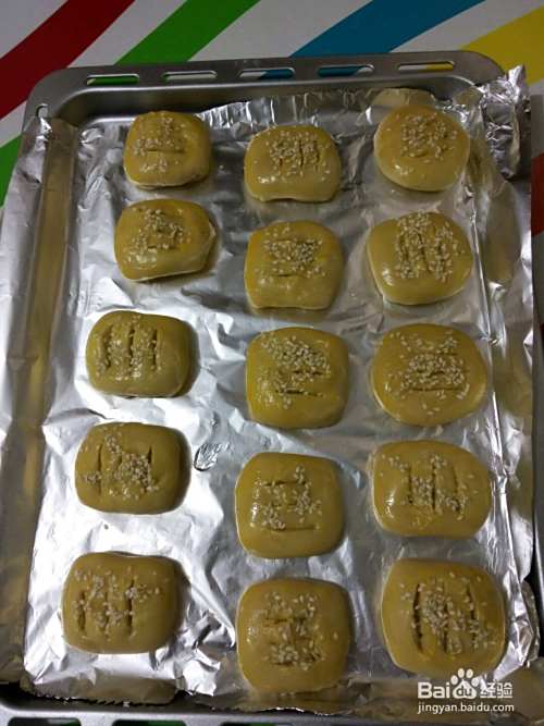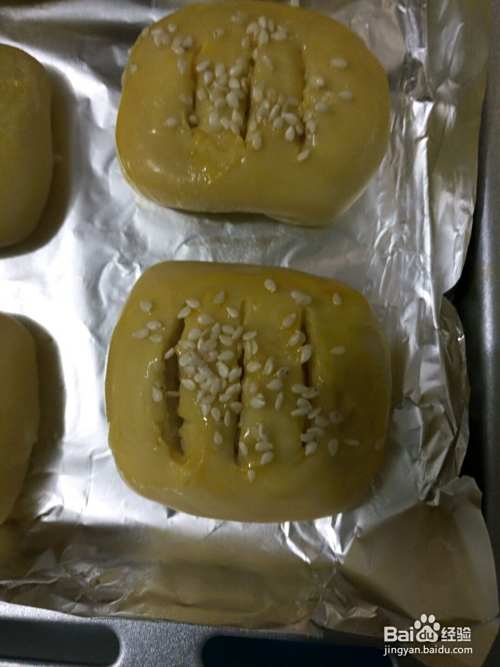 做完后在表面划三道口子 划深点要看见里面的馅 目的是烤的时候通气避免胀开,涮蛋液 撒芝麻