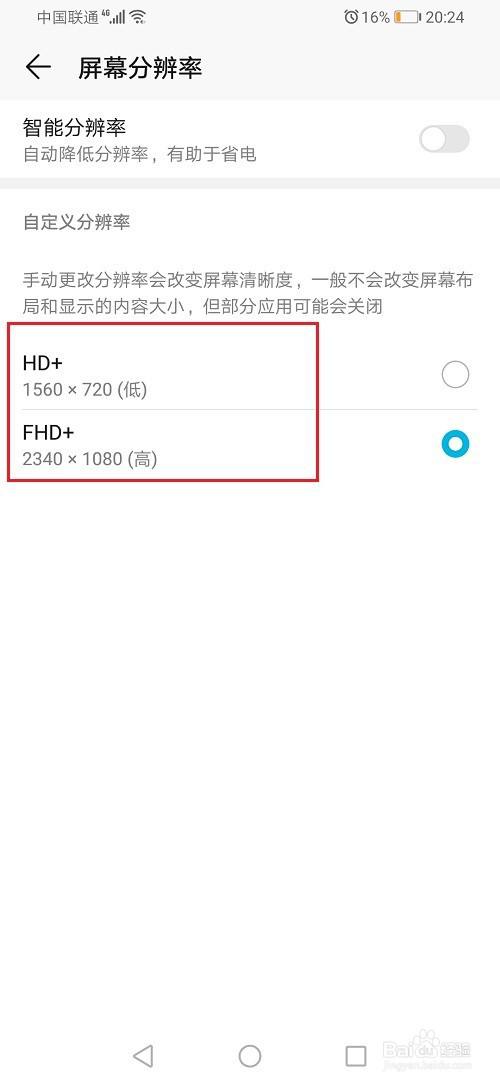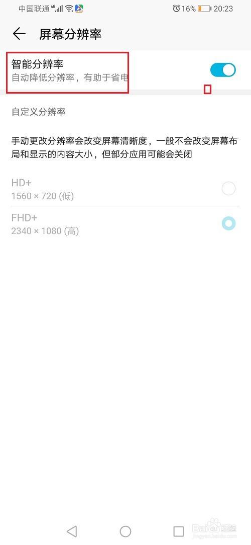 第四步在华为荣耀手机屏幕分辨率设置界面,点击关闭智能分辨率