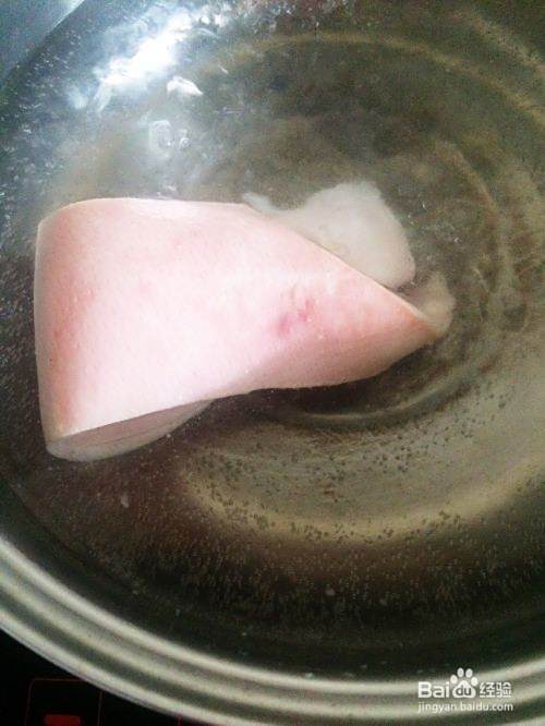 准备适量的猪皮,凉水下锅,慢慢烧开,煮5分钟~