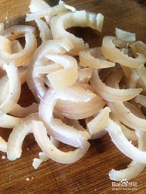 切除油脂的肉皮切成皮丝~把皮丝放入锅中加入三倍量的水~按自己的口,放入花椒、大料、姜片。大火烧开后转小火煮至40分钟后加入盐煮20分钟!