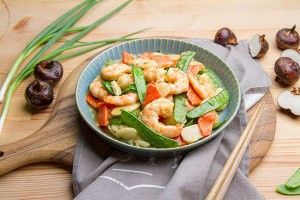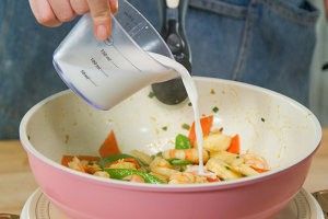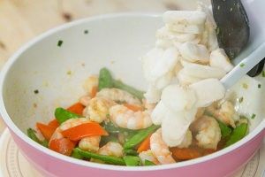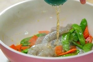 炒至荷兰豆和胡萝卜微软,加入虾仁,调入1大勺料酒继续翻炒。