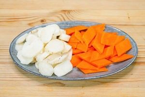 马蹄去皮切片,胡萝卜切成菱形块。