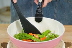 炒锅倒油烧热,放入葱姜末爆香,加入荷兰豆、胡萝卜翻炒均匀。