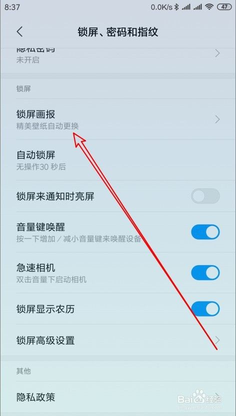 然后在打开的锁屏密码和指纹页面中找到锁屏画报的设置项