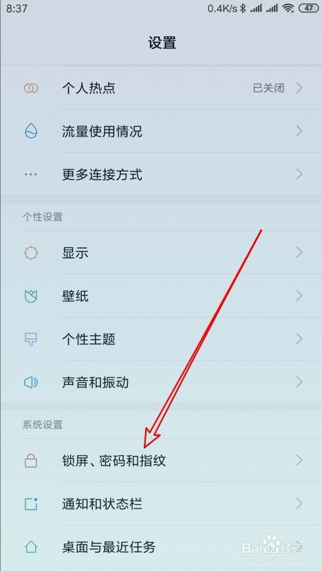 然后在打开的小米9手机设置页面,点击锁屏密码和指纹的菜单项