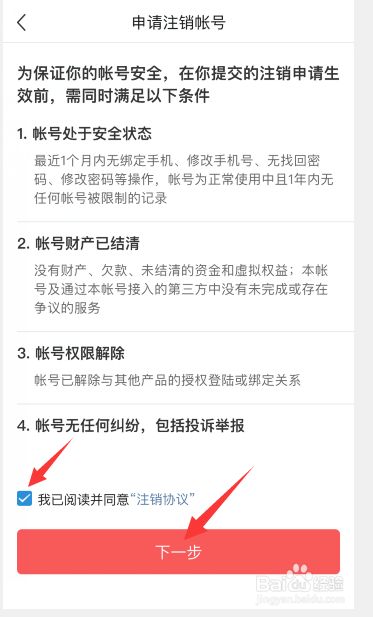 会显示注销的两个条件是否满足,如果像小编这样,“帐号财产已结清”的条件不满足的,就直接点击“帐号财产已结清”这个条件(这是准备放弃财产的操作,如果你帐号的金额足够提现了,可以先提现之后再来注销)
