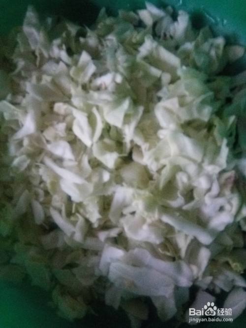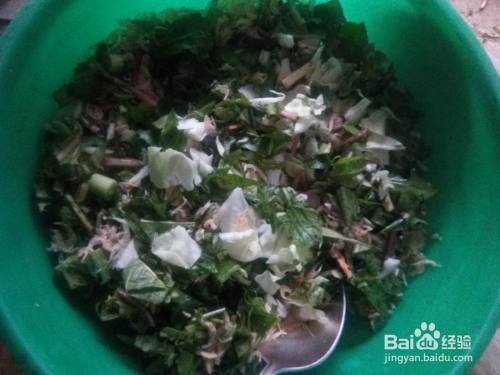 然后,将葱花放入装着大头菜碎的盆里。然后,再将切碎的婆婆丁,也放入这个盆里。