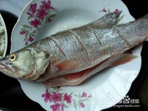 把鲈鱼切上刀花,腹内放入姜丝、葱丝,表面均匀的抹上盐。
