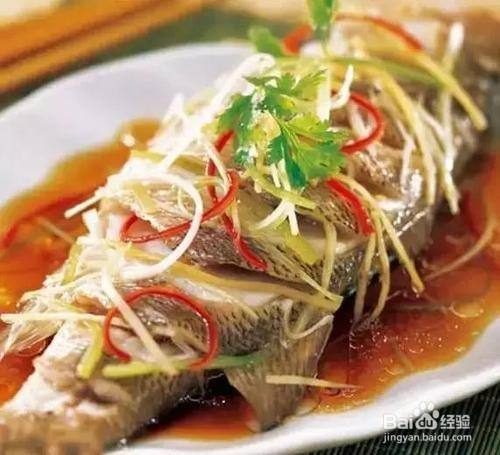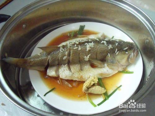 把弄好的鲈鱼放在盘中,隔水蒸20分钟。蒸好的鲈鱼拿出来,撒上葱丝、香菜。