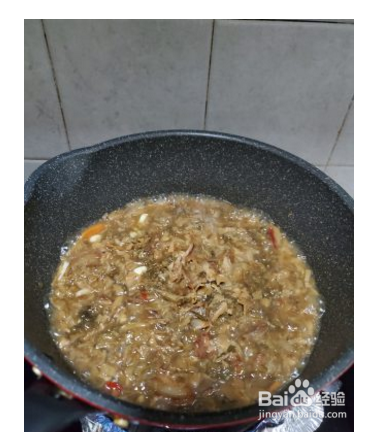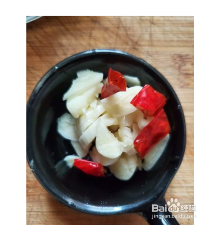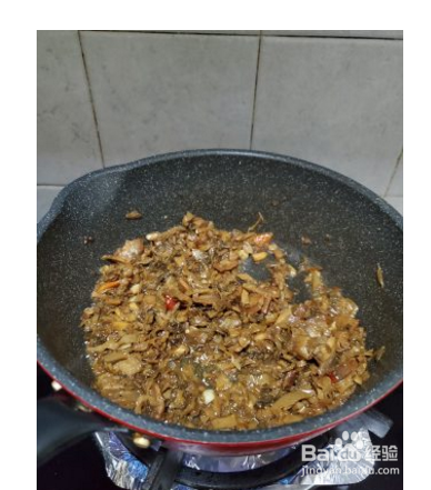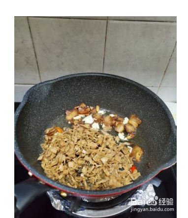 热锅放油,下五花肉中小火煸炒至焦黄再下蒜末小米辣煸出香味
