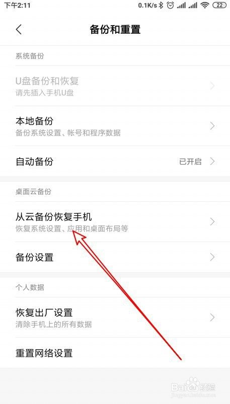 这时就会打开备份与重置的页面,在页面中我们选择“从云备份恢复手机”的设置项。