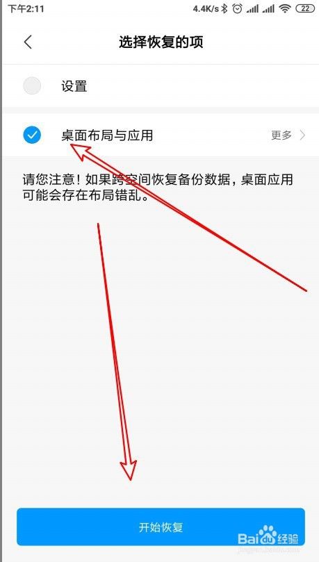 然后在打开的选择恢复的项页面勾选“桌面布局与应用”的设置项,点击下面的“开始恢复”按钮就可以了。