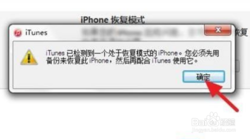 iTunes会提示检测到恢复模式的iPhone,就进入恢复模式了,iTunes弹出的窗口点击【确定】。