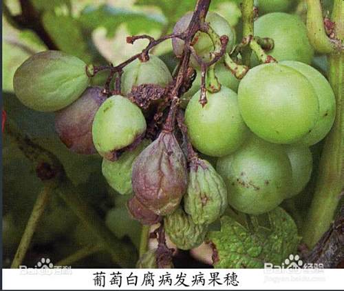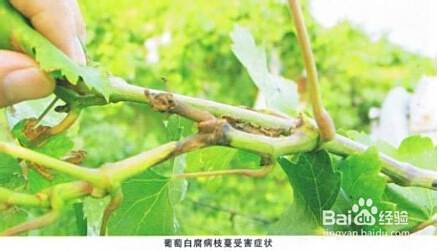 果梗和穗轴上发病处先产生淡褐色水浸状近圆形病斑,病部腐烂变褐色,很快蔓延至果粒,果粒变褐软烂,后期病粒及穗轴病部表面产生灰白色小颗粒状分生孢子器,湿度大时由分生孢子器内溢出灰白色分生孢子团,病果易脱落,病果干缩时呈褐色或灰白色僵果。枝蔓上发病,初期显水浸状淡褐色病斑,形状不定,病斑多纵向扩展成褐色凹陷的大斑,表皮生灰白色分生孢子器,呈颗粒状,后期病部表皮纵裂与木质部分离,表皮脱落,维管束呈褐色乱麻状,当病斑扩及枝蔓表皮一圈时,其上部枝蔓枯死。叶片发病多发生在叶缘部,初生褐色水浸状不规则病斑,逐渐扩大略成圆形,有褐色轮纹。