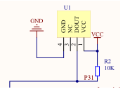 由于传感器DHT11输出的为数字信号、封装简单,所以在本设计中可以很容易的将它与单片机STC89C52相连来实现预设功能。此处使用传感器的pin2口连接单片机的P3.1口,单片机的P3.1口为数据口,可以用来收发串行数据,因为本设计是在一块较小的电路板上完成,连接温湿度传感器的线长小于20m,所以采用的上拉电阻为5kΩ,将其连接于电源与温湿度传感器DHT11的pin2口之间,其pin3口悬置,pin1与pin4口分别接电源和地。电路图如图所示
