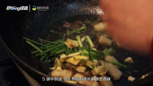 4锅中倒油,加入葱段和姜片翻炒出香味,加入一大勺料酒和一大勺生抽。