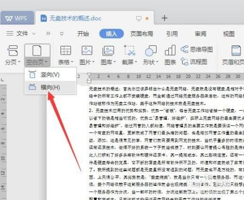 如果要在当前页的后面插入空白页,则把光标定位在当前页的文章末尾,再点击空白页按钮下的竖向或横向即可。