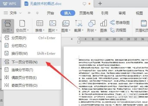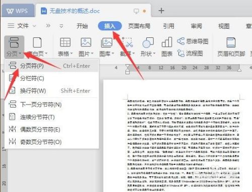 还有另一种插入空白页的方法,即点击插入选项卡,再点击功能区中的分页按钮,点击分页符就可以在光标处的后面插入空白页。或点击下一页分节符,也可以插入空白页。