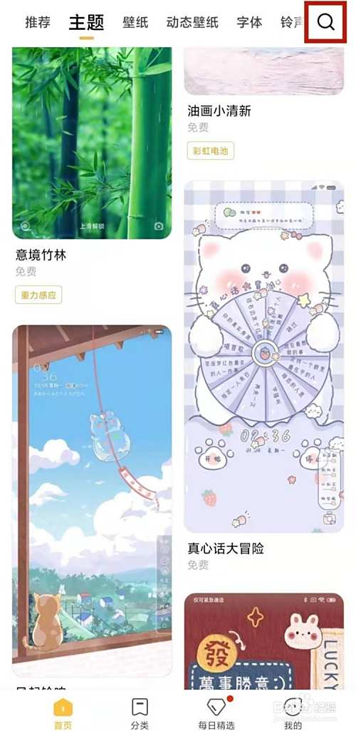 1、打开主题壁纸app,点击右上角的搜索图标,在搜索框中搜索【充电特效】。