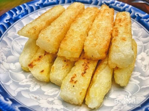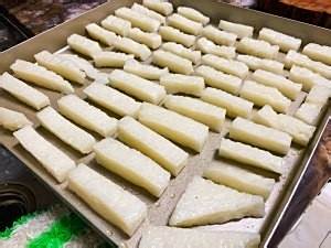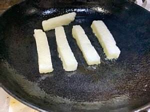 平底锅烧热后,大火,倒入油,油热后,转中小火,放入刚才切好的糍粑条。完成!