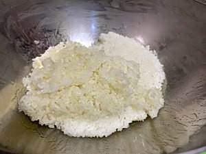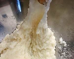 反复捶打的过程中,对糯米进行翻动。大约盅二十分钟左右,可以看到糯米已经被盅开,出黏性,并明显感觉捶打有些费力了。然后再盅五分钟左右即可。