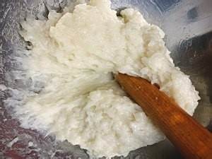 拿一个擀面杖或类似的物体,洗干净后表面抹油后,用擀面杖一端快速捶打盆中的糯米。