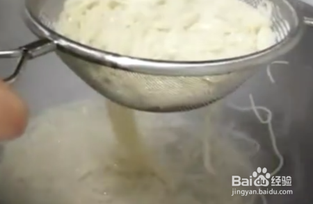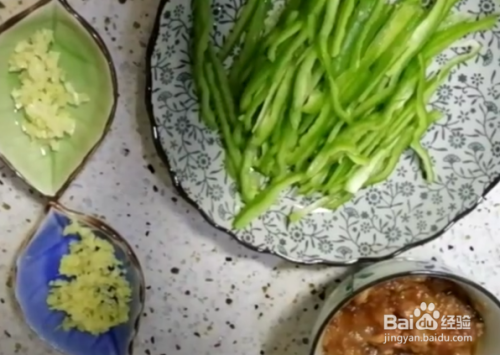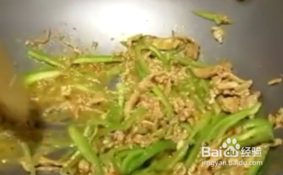 翻炒一两分钟倒青椒丝,炒好后舀起备用
