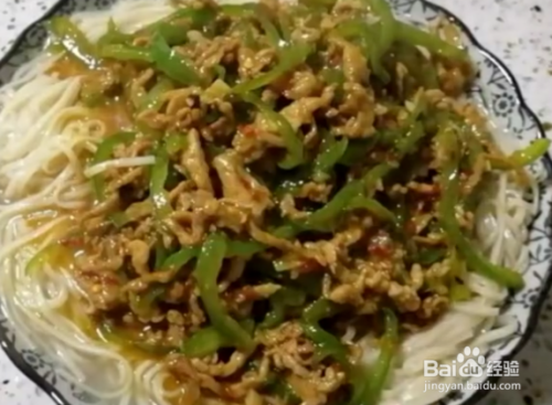 面装盘子里后,上面盖上炒好的青椒肉丝
