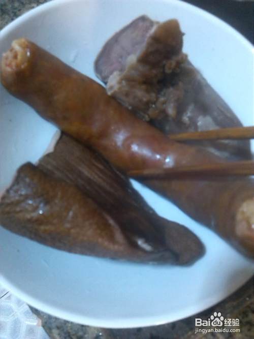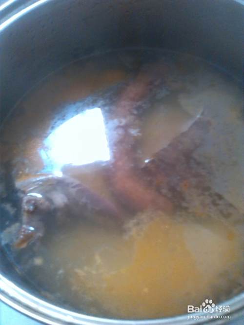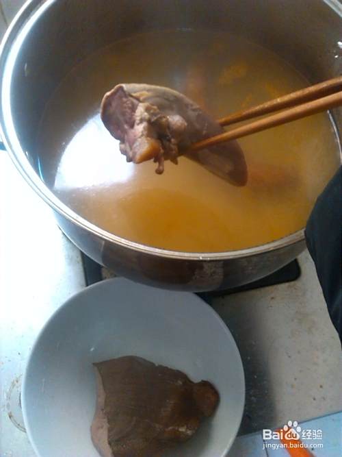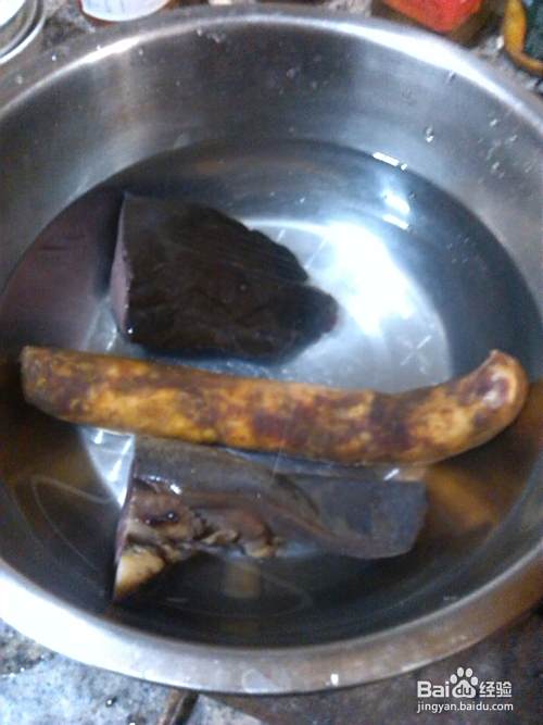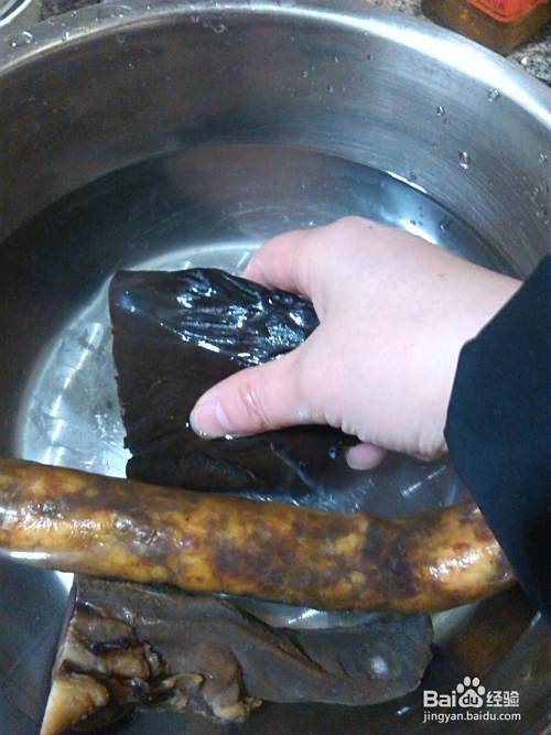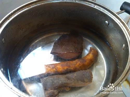 锅里放好适量的水,将香肠、猪肝、舌头放入水中;