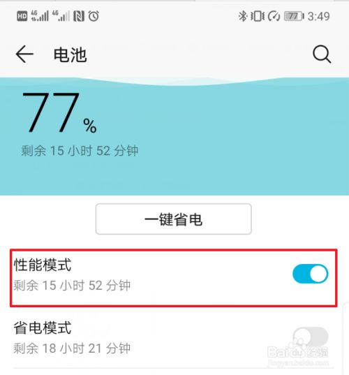 点击进入电池界面后,可以看到页面中的性能模式的选项。如果上方出现这个图标,这个模式后方的开关就是出于打开的状态。
