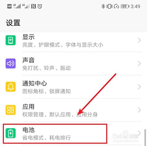 进入设置以后,在设置列表中我们选择“电池”的选项进入。