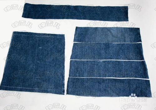 把牛仔裤腿裁出一段。从侧边剪开(如果需要做大一点的包,可用两条裤腿拼接)。
