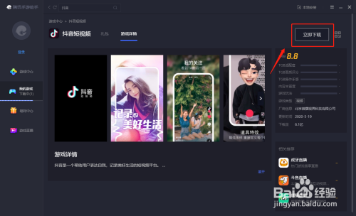 进入腾讯助手首页,选择游戏中心,在搜索框输入抖音,回车搜索点击“抖音”进入下载页。如果提示必须使用标准引擎安装,我们点击一键安装按钮即可。